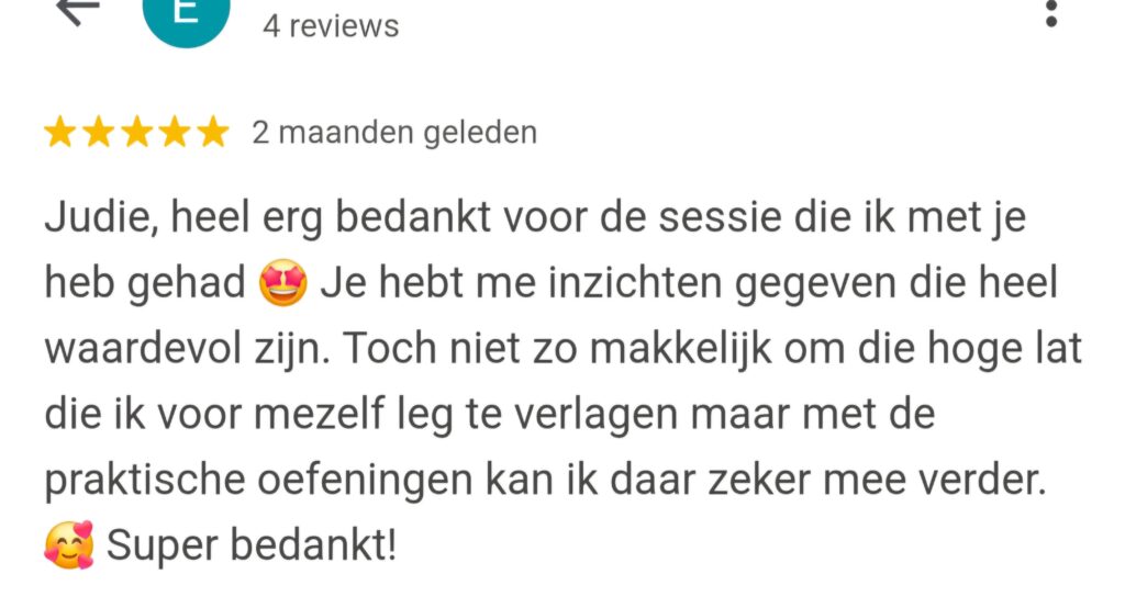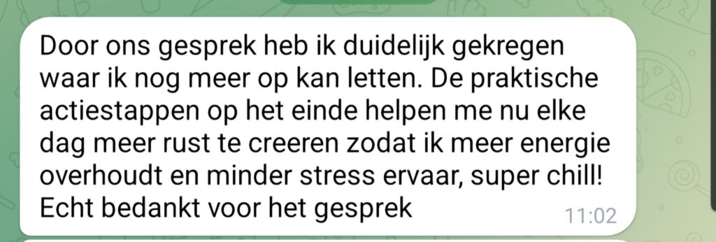 Tijdens de scan duiken we meteen in jouw persoonlijke situatie. Wat trekt je leeg? Wat kan anders? Ik geef je heldere inzichten en praktische handvatten die je direct kunt toepassen, zodat je hoofd rustiger wordt en je lijf meer ontspant.