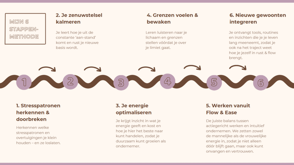 Een 1:1 traject van 4 maanden waarin we je systeem resetten, je patronen breken en bouwen aan een krachtige, kalme basis. Jij gaat ondernemen op jóuw voorwaarden.