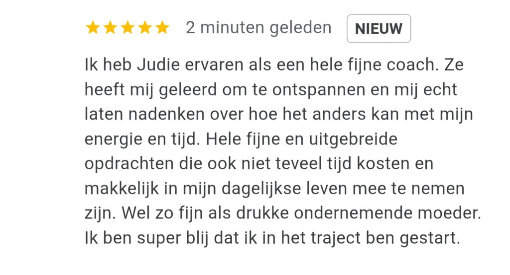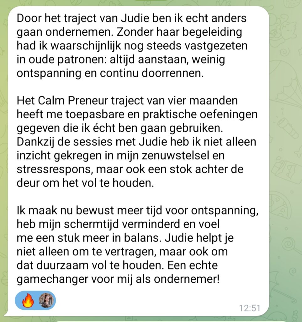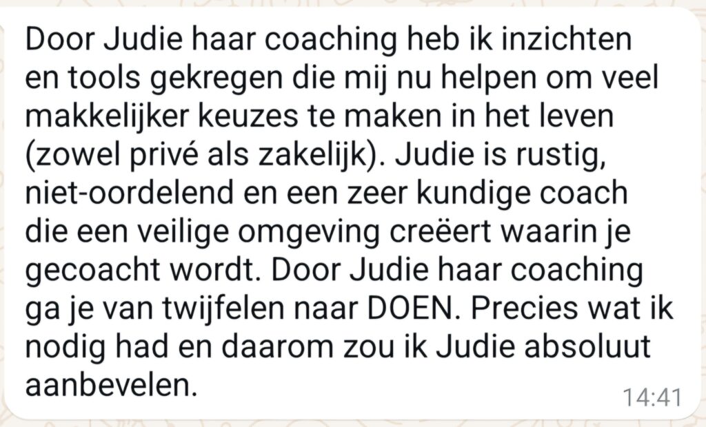 "Zonder de begeleiding van Judie had ik waarschijnlijk nog steeds vastgezeten in oude patronen: altijd ‘aan’ staan, weinig ontspanning en continu doorrennen"